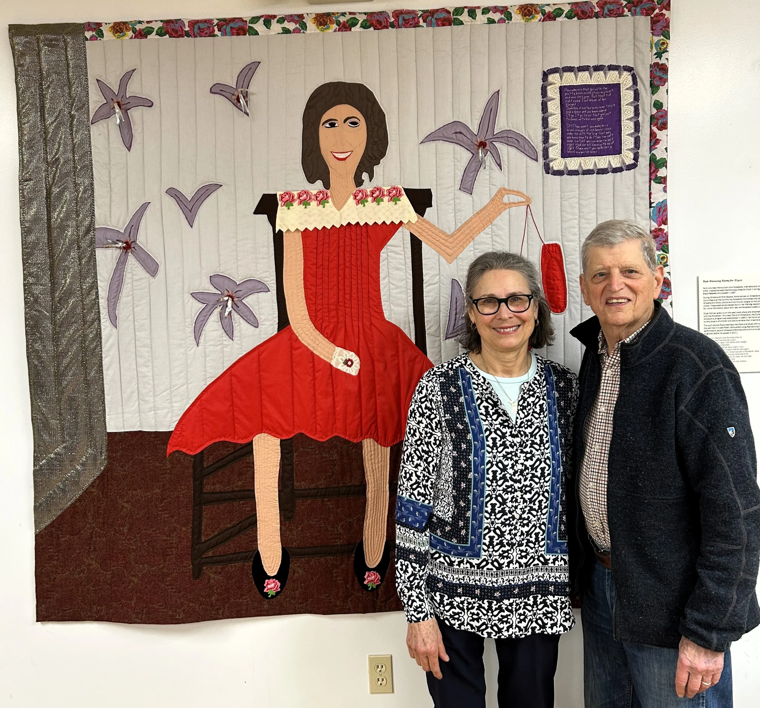 Ann Kowaleski and Eric Torgersen in front of Red Dancing Shoes quilt- for Elyce